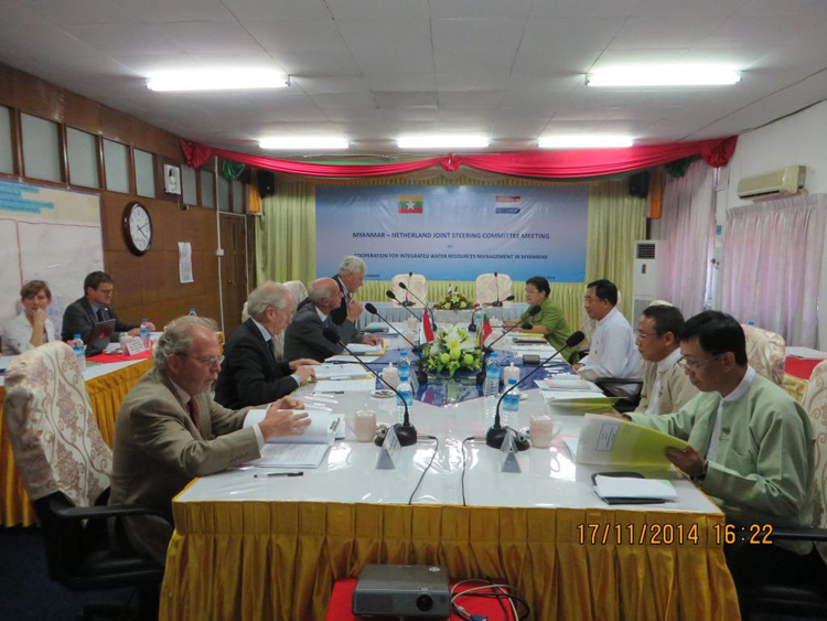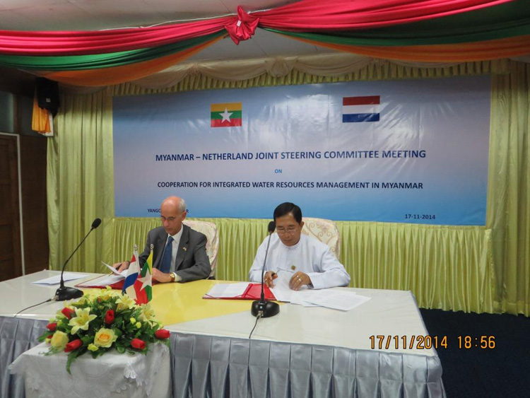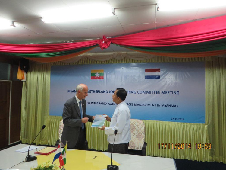 As the part of cooperation between Myanmar and the Netherland according to the MoU for cooperation in the field of Integrated Water Resources Management signed in May 2013, the second Joint Steering Committee (JSC) between Myanmar and Netherlands was held and Multiannual Working Plan was signed on 17th November 2014 at DWIR office in Yangon, Myanmar. Mr. Peter Heij, NL Competent Authority of the MoU, Director General of the Directorate for Spatial Development and Water Affairs, the Ministry of Infrastructure and the Environment, handed over the Executive Summary of Myanmar Integrated Water Resources Management Strategic Study “From Vision to Acction” to U Htun Lwin Oo, Myanmar Competent Authority of the MoU, Secretary of National Water Resources Committee - NWRC, Director General of the Directorate of Water Resources and Improvement of River Systems, Ministry of Transport.